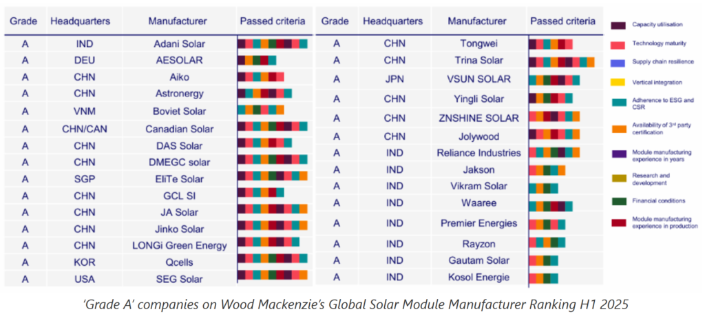 شرکتهای JA Solar و Trinasolar بهصورت مشترک رتبه نخست فهرست جهانی تولیدکنندگان ماژول خورشیدی مؤسسه Wood Mackenzie در نیمه اول سال ۲۰۲۵ را به خود اختصاص دادند. این دو شرکت بهترتیب امتیاز ۹۱.۷ و ۹۱.۶ را کسب کردند.